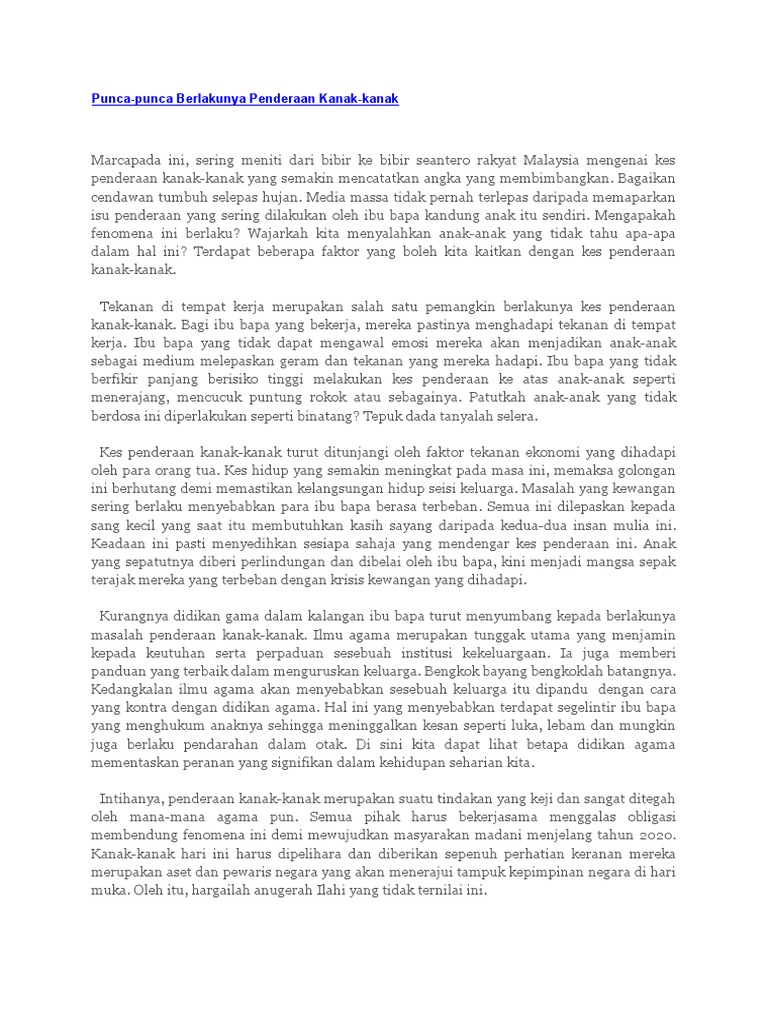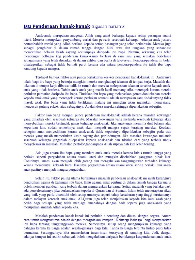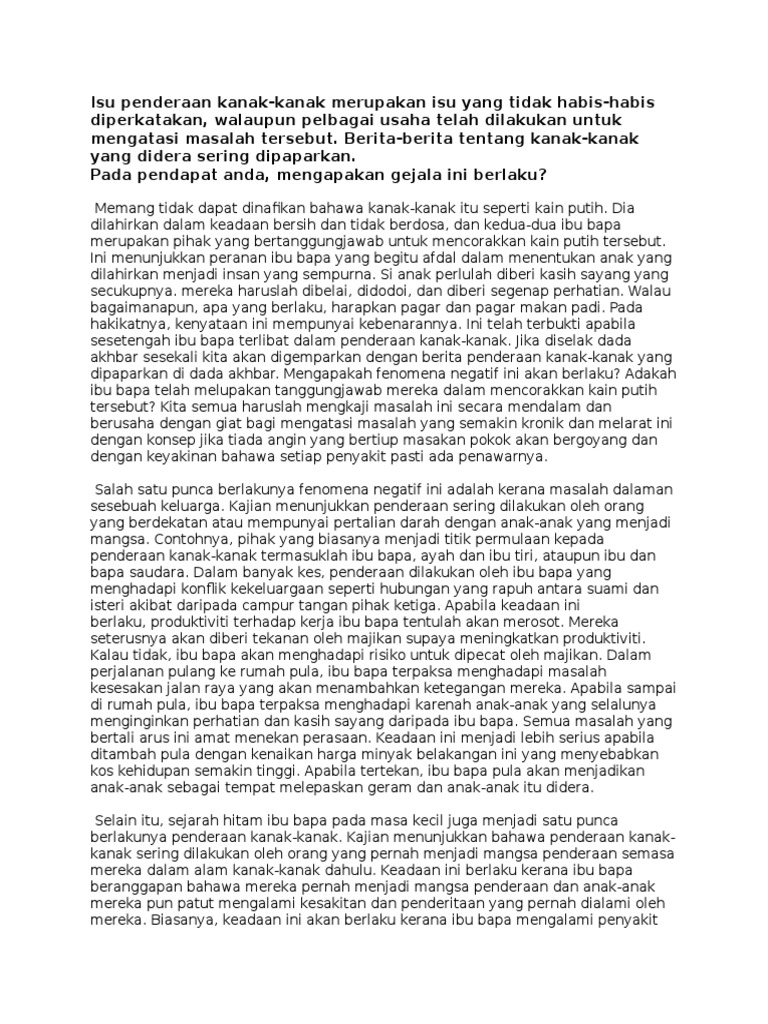 Mangsa anak keempat daripada lima adik-beradik ditemui tidak sedarkan diri. Isu penderaan kanak kanak Punca punca berlakunya kes penderaan kanak-kanak LANGKAH-LANGKAH MENGATASI MASALAH PENDERAAN KANAK-KANAK Pendidikan keibubapaan. Setiap kanak-kanak mempunyai hak untuk hidup sihat dan bebas dari keganasan.